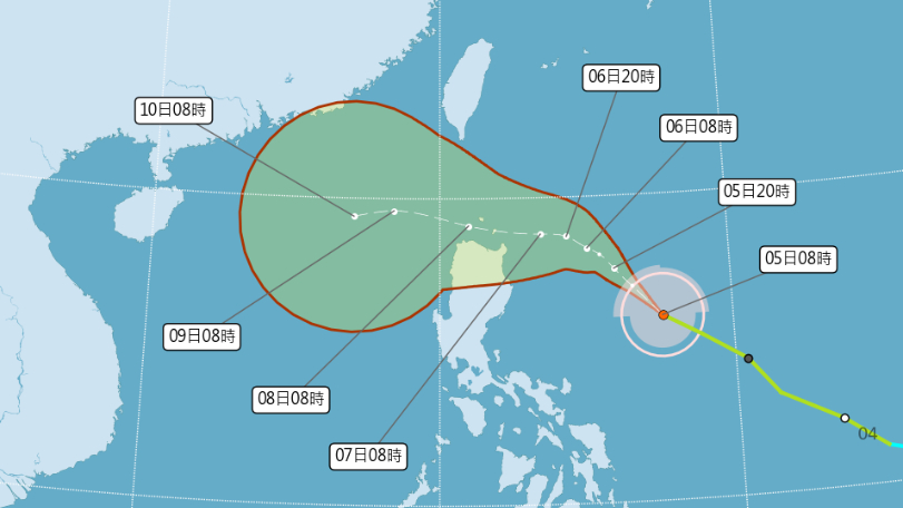 目前來看,直接威脅臺灣機會低,但週五至週末(08-10日)當颱風西行通過巴士海峽進入南海期間,將間接加強東北季風南下強度,北部及東部將為陰有短暫陣雨天氣,尤其北海岸、東北角至宜蘭地區降雨相對之下將較持續,須留意有較大累積降雨可能,週末還請多加留意東北部的降雨機會了。