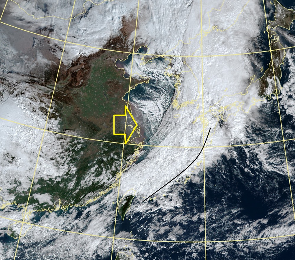 鄭明典並曬出照片,指出圖中黃色箭頭的部份可以看到「鋒面後的雲街」,一排排小積雲串成的雲街,統稱為「冷平流雲系」。