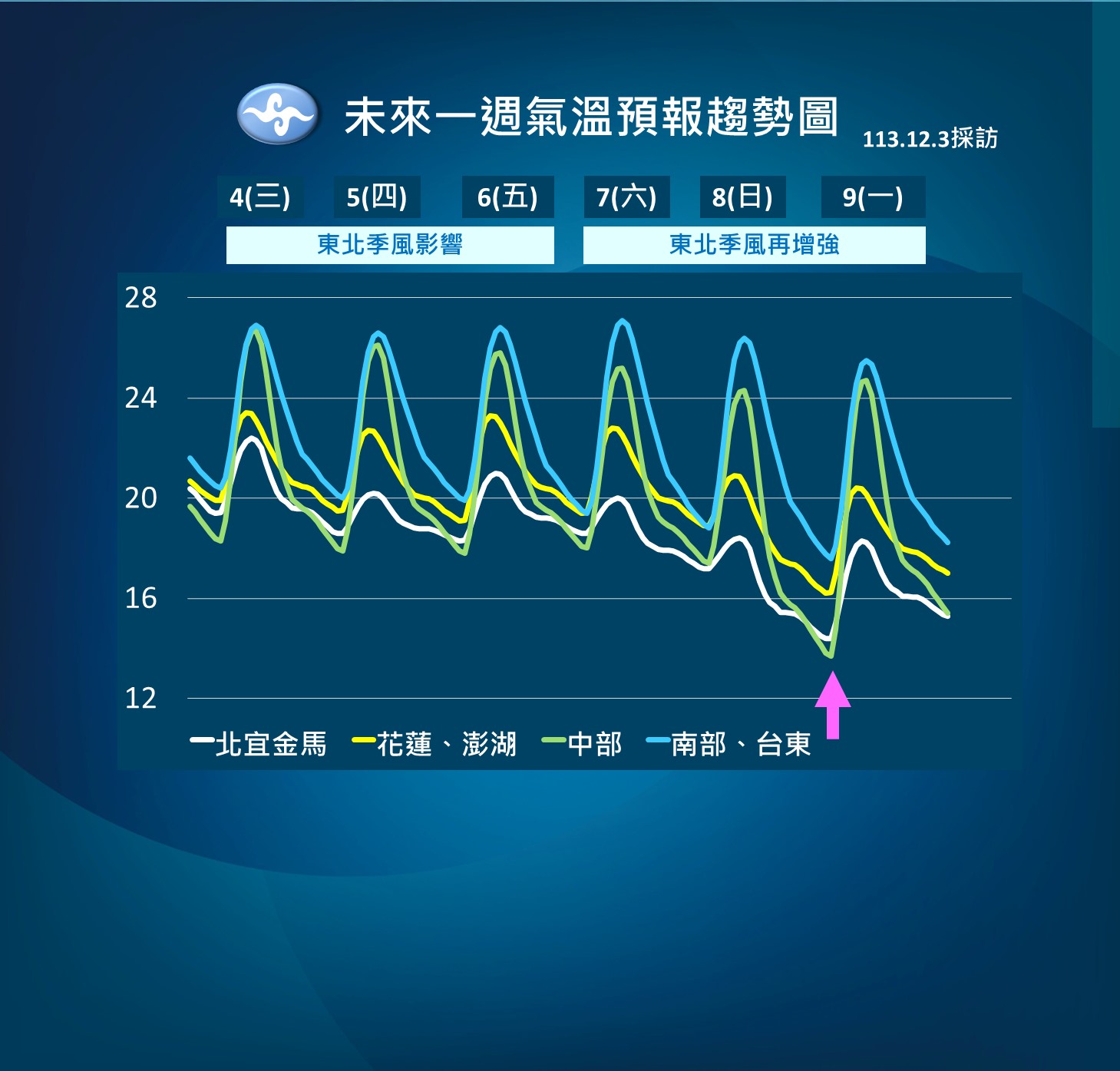 中央氣象署今天(12/3)表示,明天(12/4)開始受到東北季風影響,東部、北部及東北部地區都會有雨勢,而且週六(12/7)將會有一波冷空氣南下,北部地區低溫下探14度。
