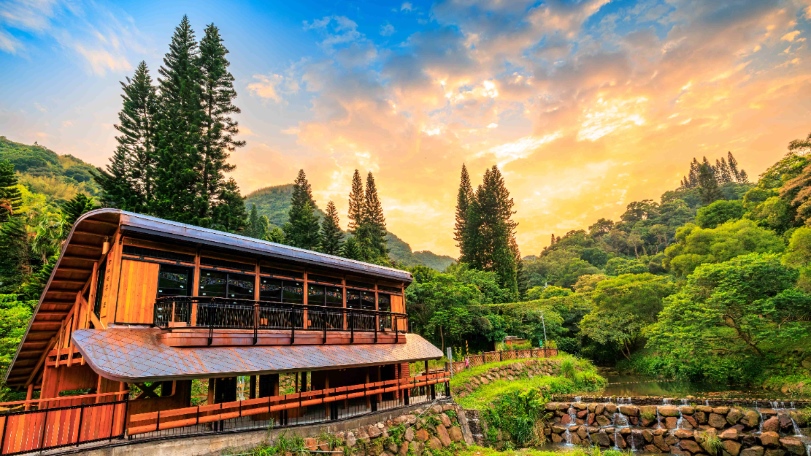 座落在水岸旁的「金瑞田嬰小屋」(「田嬰」在台語中意指蜻蜓) ,擁有絕佳的眺望視野,在點位選擇上,盡可能減少對環境的干擾。在建材的選用上,則以100%MIT的疏伐木為主要結構,採用會隨著時間融入環境色調的紅銅屋瓦,手工玻璃剪黏出蜻蜓的七彩羽翼等,而選用在地素材不僅能降低長途運輸的碳足跡,這些溫暖的自然色調也將隨著時間與空間的醞釀,和周邊環境揉合為一體。