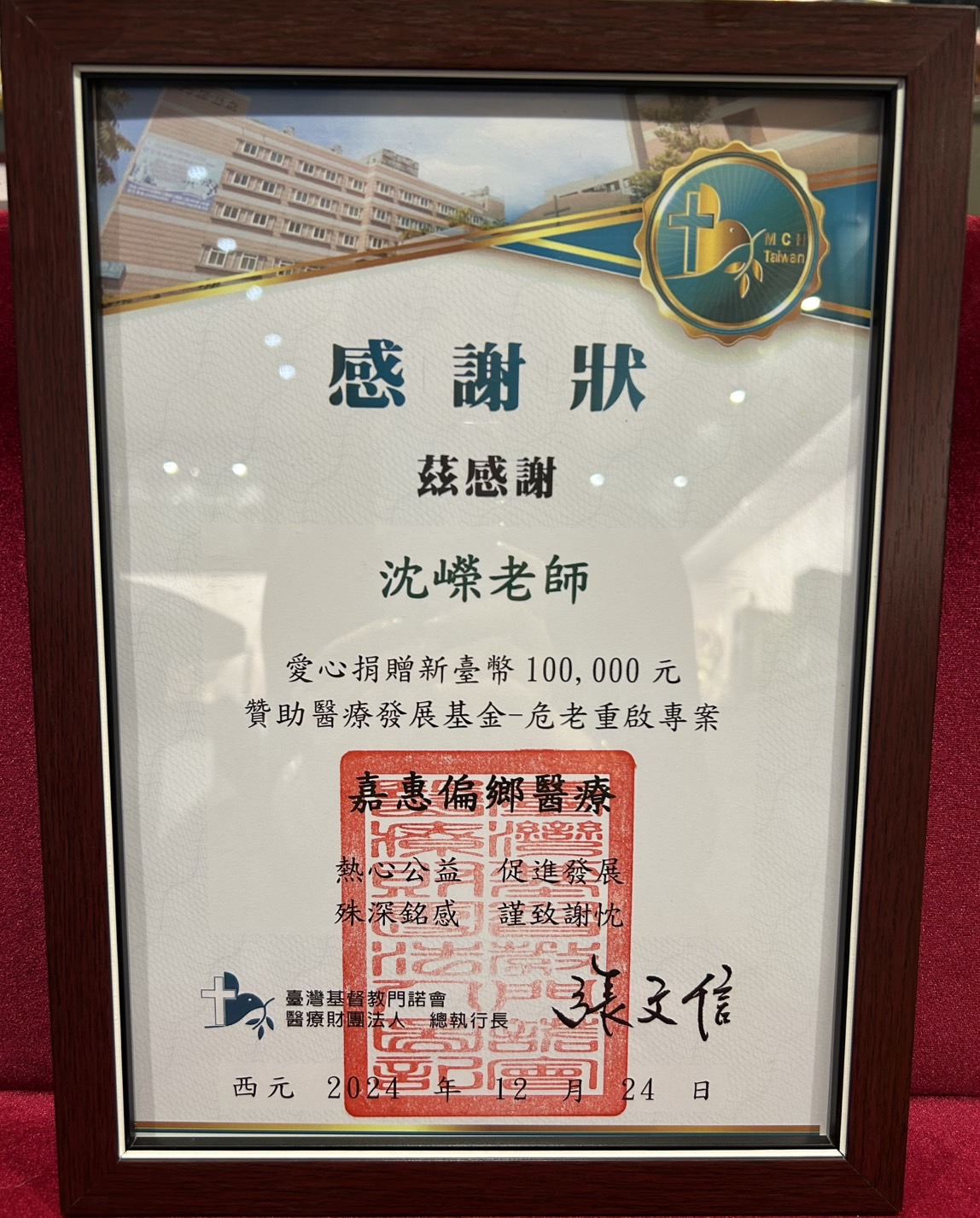 2024年4月3日花蓮強震,門諾醫院原有兩棟超過三十年的老舊大樓結構評估已無法再補強,因此原定於2025年啟動的危老大樓重啟「門諾急重症醫療大樓興建計畫」,提前於2024年底展開,此項計畫費用初估超過18億,對於位在偏鄉、以公益為服務宗旨的門諾醫院來說,無疑是一份沉重的負擔,沈嶸拋磚引玉捐贈現金十萬元,期待大眾關注支持門諾醫院危老重啟暨門諾急重症醫療大樓興建計畫,幫助門諾持續守護醫療資源相對不足的花蓮地區。