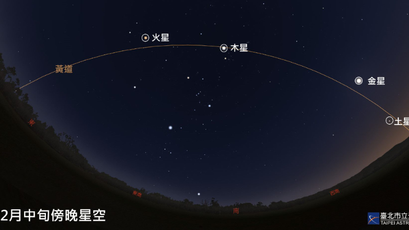 今年冬夜星空格外燦爛,除了許多明亮的恆星外,金星、土星、火星與木星等四顆肉眼可見的超亮行星也加入其中,傍晚過後沿著黃道排列成弧,將夜空妝點得更加璀璨;天文館展示場2月上半月即以「太陽系行星大連線」為主題,向大家介紹這個美麗天象的相關知識;下半月則介紹近期傍晚西方夜空中最亮的明星:金星,它於2月中下旬達到最高亮度-4.9等,在黑暗處甚至可對物成影,也是夜空中亮度僅次於月球的耀眼行星!