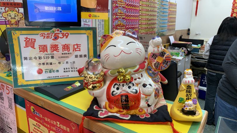 他們進入彩券行,又看到店內一對招財貓對著他們招財,看到店內的微笑招財貓很可愛像是歡迎他們招手,便一起選購刮刮樂,陸續買了3張$1000元面額刮刮樂。