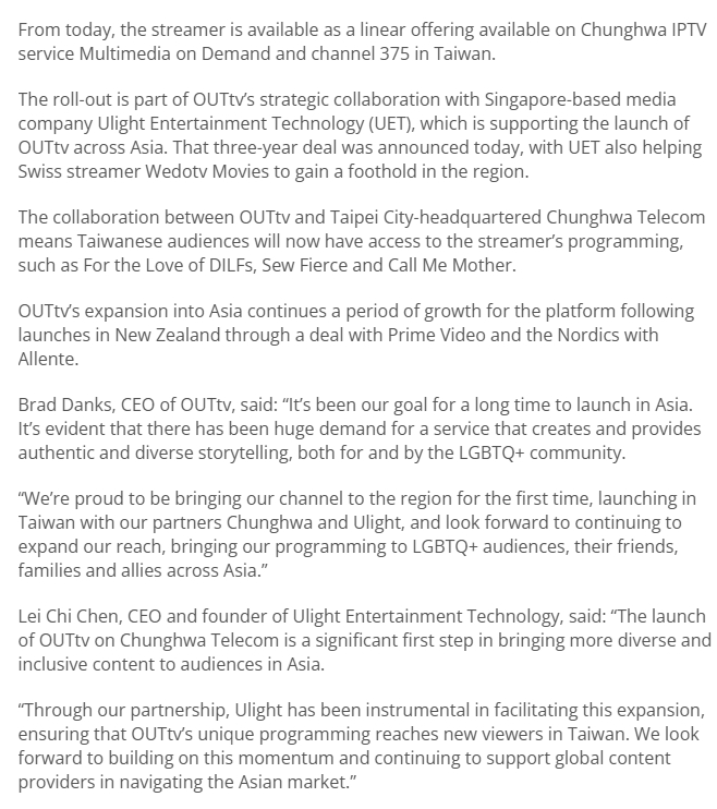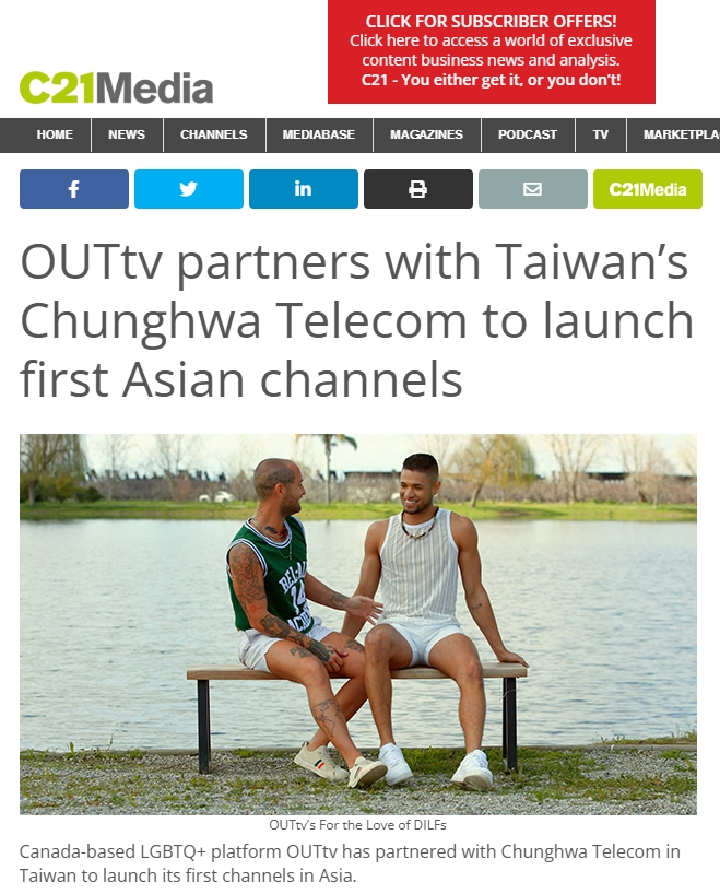 OUTtv partners with Taiwan’s Chunghwa Telecom to launch first Asian channels