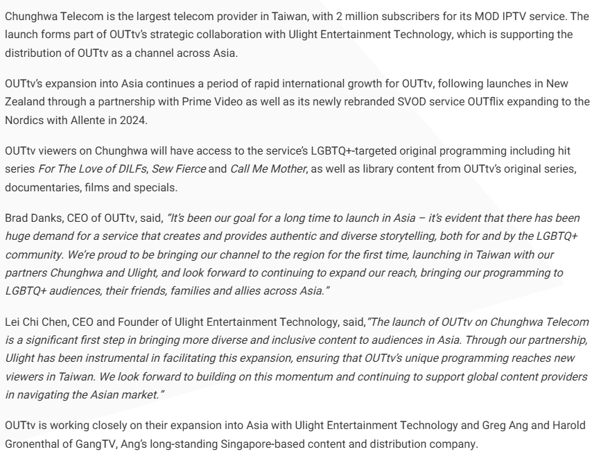 OUTtv expands into Asia with Chunghwa Telecom channel launch