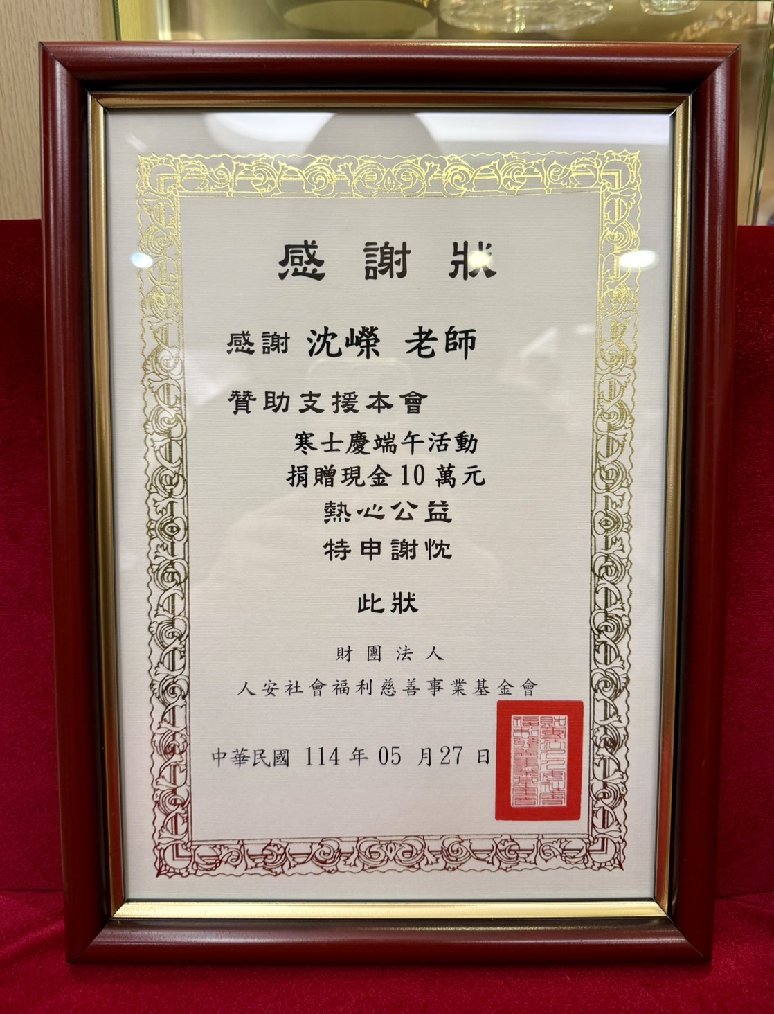 沈嶸特別捐贈十萬元現金,支持「寒士慶端午」關懷活動,並授權合作「沈嶸魔法開運水晶瓶」義賣,義賣所得將全額提供「財團法人人安社會福利慈善事業基金會」幫助流落於社會邊緣的街友「防飢、防病、防寒」服務外,更提供清寒單親媽媽、待業婦女、家境清寒之國中小學童、65歲以上清寒孤苦老人心靈輔導及工作轉介,秉持著「給魚也給釣竿」的精神,幫助寒士們順利重返社會自力更生,沈嶸誠摯邀請社會大眾一同響應捐款行動,您的每一份支持,都將是改變生命的力量。
