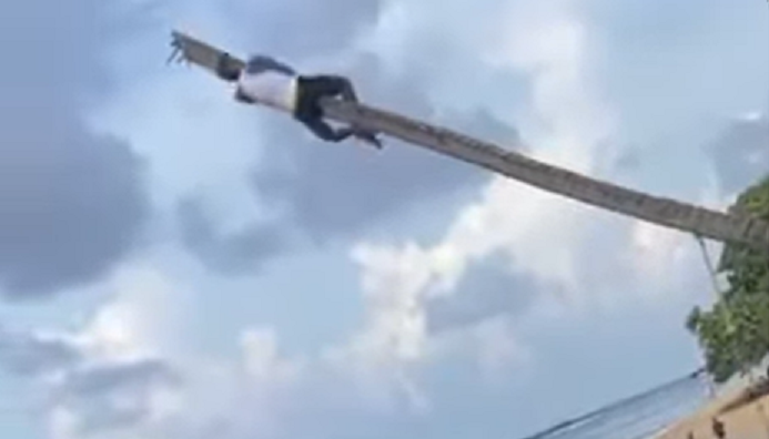 綜合外媒報導,這起事件發生於哥斯大黎加的國慶日當天,一名男子被捕捉到在普塔烏瓦海灘旁嬉鬧,爬上一顆棕櫚樹,從畫面中可見,他當時不停地往樹枝的頂端爬去,但最後樹枝支撐不了他的重量,便應聲斷裂。