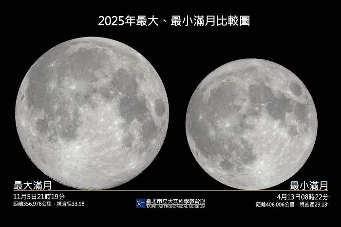 臺北天文館說明,由於月球繞行地球的軌道為橢圓形,因此地月距離會隨時間而改變;當滿月發生在地月距離最近的近地點附近時,稱為「近地點滿月」,也就是俗稱的「超級月亮」;一年中可能出現數次超級滿月,今年11、12月皆是。這次的「望」發生在5日21時19分,離通過近地點僅約9小時,與地球距離約356,978公里,月球視直徑達0.57度,也是自2019年2月以來的最大滿月。