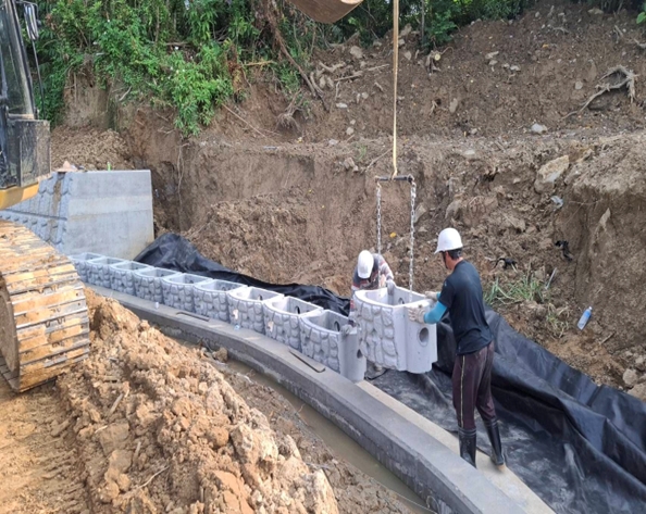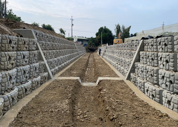 ▲ 以預鑄工法施作生態槽護岸,減量混凝土及加速植生恢復