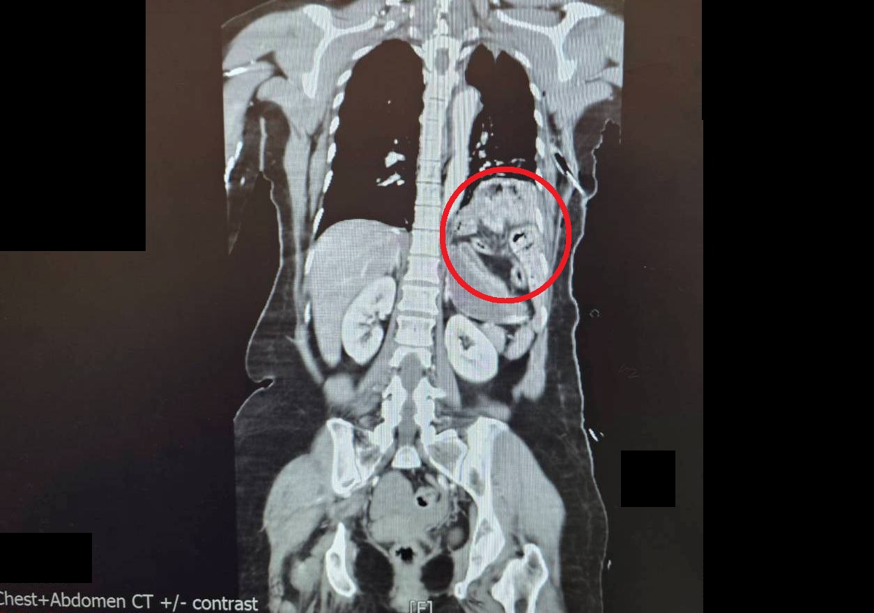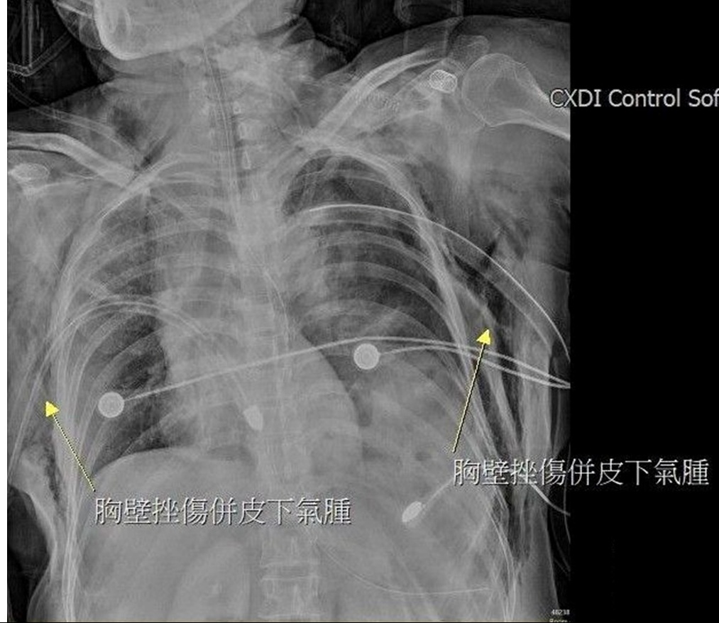 陳姓女子被送抵急診時,出現嚴重的雙側氣胸與皮下氣腫,呼吸極度困難。經全身電腦斷層掃描發現,強大的撞擊力導致她的左側橫隔膜破裂,原本應在腹腔的胃部及部分腸道,竟位移進入左側胸腔,嚴重壓迫左肺,導致肺部無法擴張。此外,檢查更發現其下腹部大量出血(腸繫膜血管破裂)、左腳踝骨折,背部還有大面積的2至3度擦燙傷,傷勢遍布全身。