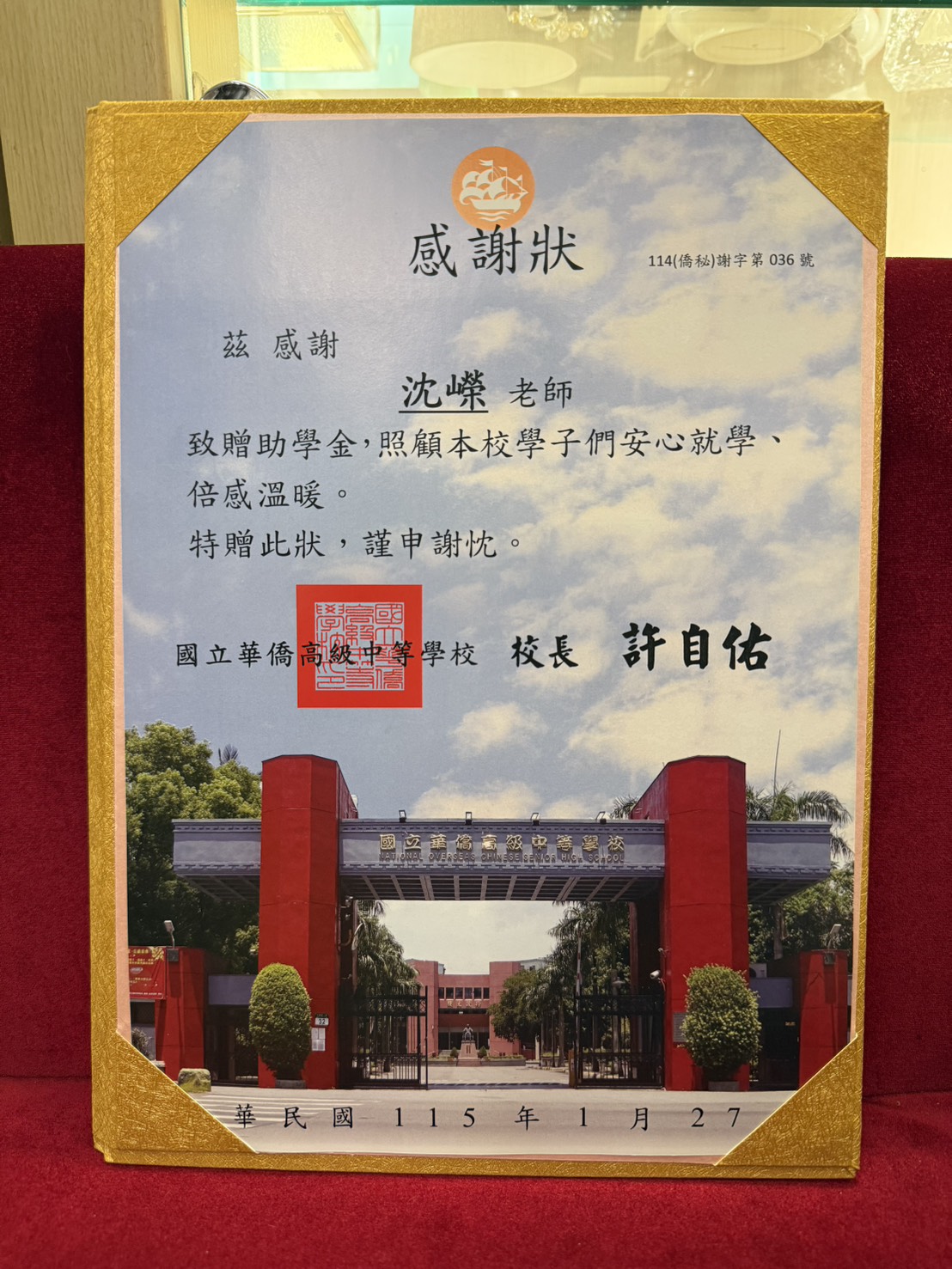 近年緬甸政局動盪,為了躲避軍政府強制徵兵與無預警抓捕,許多年輕學子不得不逃離家鄉,甚至花費上千萬緬幣「買通關」,耗盡積蓄歷經驚險抵達台灣,許多學生在台每月僅能靠約3,000元台幣度日。沈嶸老師得知這些生活陷入困境的緬甸僑生,陷入「喝水止餓」的困境後,秉持公益精神,透過普仁基金會設立「沈嶸老師獎助學金」提供急難救助與生活支持,期望解決學子們三餐溫飽的燃眉之急,讓他們有能力添購禦寒衣物與書籍,幫助這些歷經戰火的孩子在台灣安心求學,點亮未來的希望。