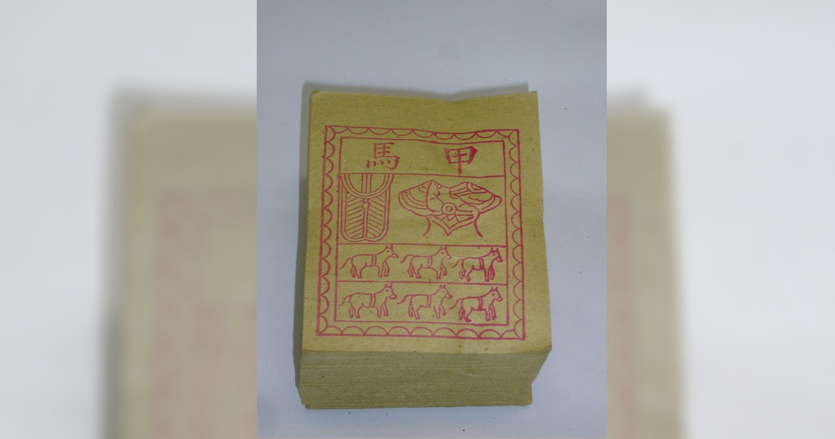 ▲專門用在「送神」和「迎神」時,甲馬上印有神明的神馬座騎,以及在神明一旁的護法兵將們專用的頭盔、盔甲、盾牌等兵器。(圖/楊登嵙提供)