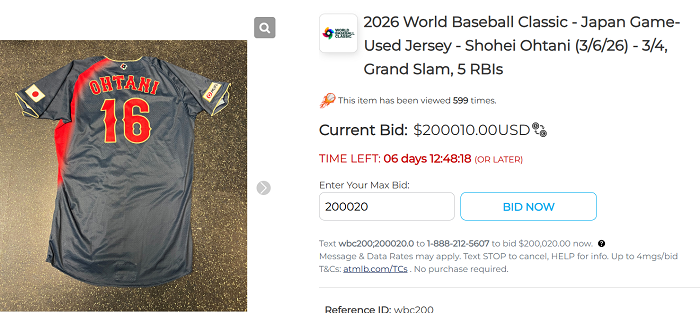 日本隊球星大谷翔平,先前在經典賽小組賽對上中華隊之戰,從鄭浩均手中擊出一發滿貫砲,該場比賽所穿的球衣已被丟上官方拍賣平台,截至目前,出價已來到200010美元,相當於新台幣640萬元,很難想像這件球衣最後會以多少金額來成交。